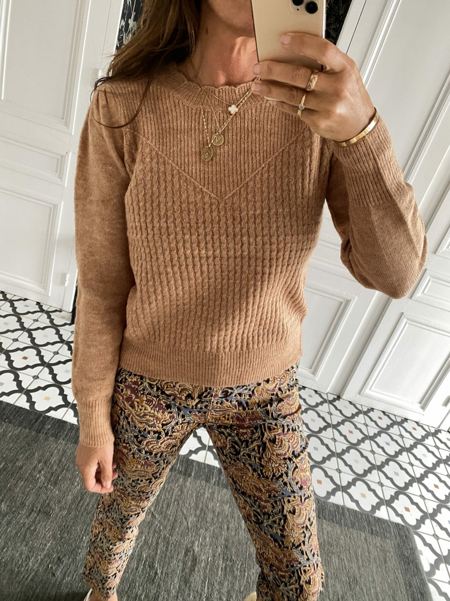 Pull fantaisie manches froncées camel